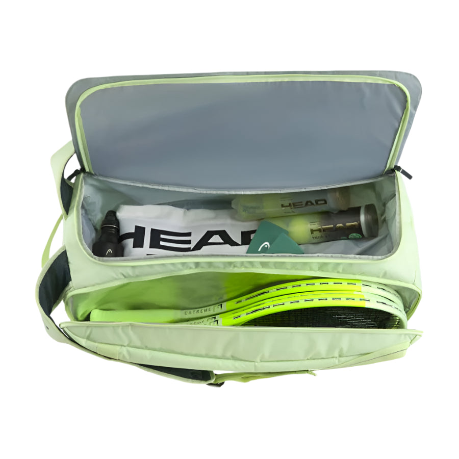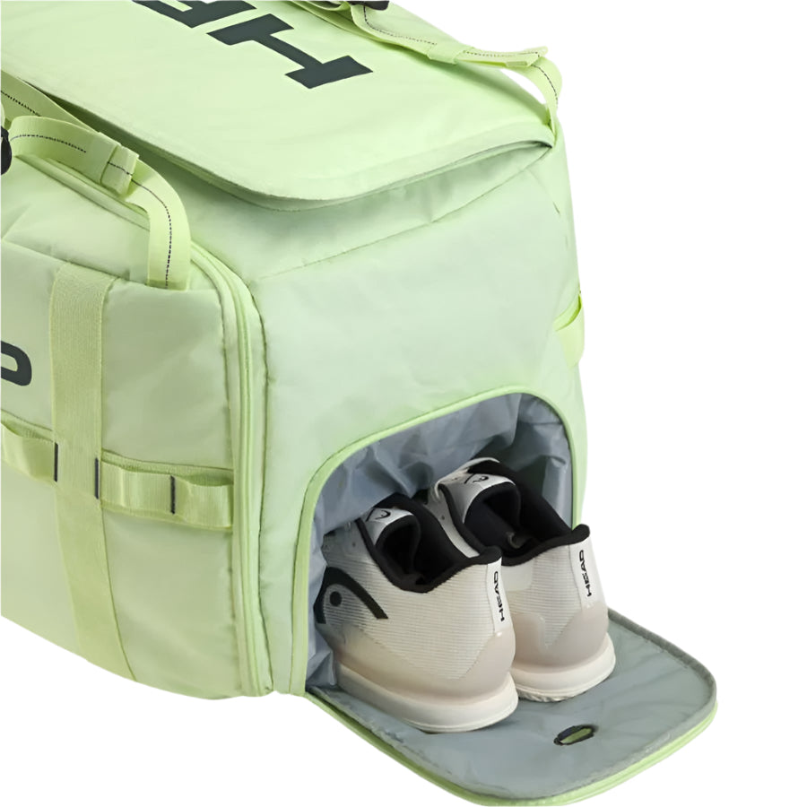 The PRO DUFFLE BAG L, which has been updated with a new, modern design that matches the EXTREME racquet series, is a stylish travel companion. Also upgraded with a new ripstop fabric that enhances durability, this bag gives you the space you need when you’re on the road. You can comfortably fit up to 9 racquets in the two spacious compartments. The additional inside mesh pocket and the outside pocket provide additional space for quick access, while the 2-way carry system lets you pick whether you want to flip the bag over your shoulder or onto your back for extra flexibility. The climate control technology CCT+ in one of the main compartments protects your racquets from higher temperatures. As an illustration of HEAD's commitment to sustainability, the bag comes with a hangtag crafted from recycled paper and secured with hemp cord.