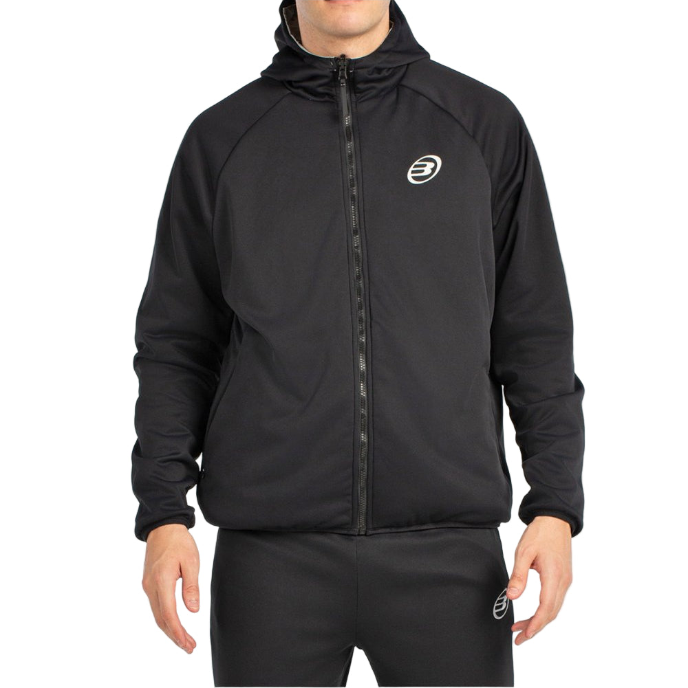 Reversible jacket with a hood, full zip, and zippered side pockets. Made of polyester interlock fabric with a tone-on-tone graphic on the back and logo on the front on one side and polyester taffeta with a logo on the front on the other.